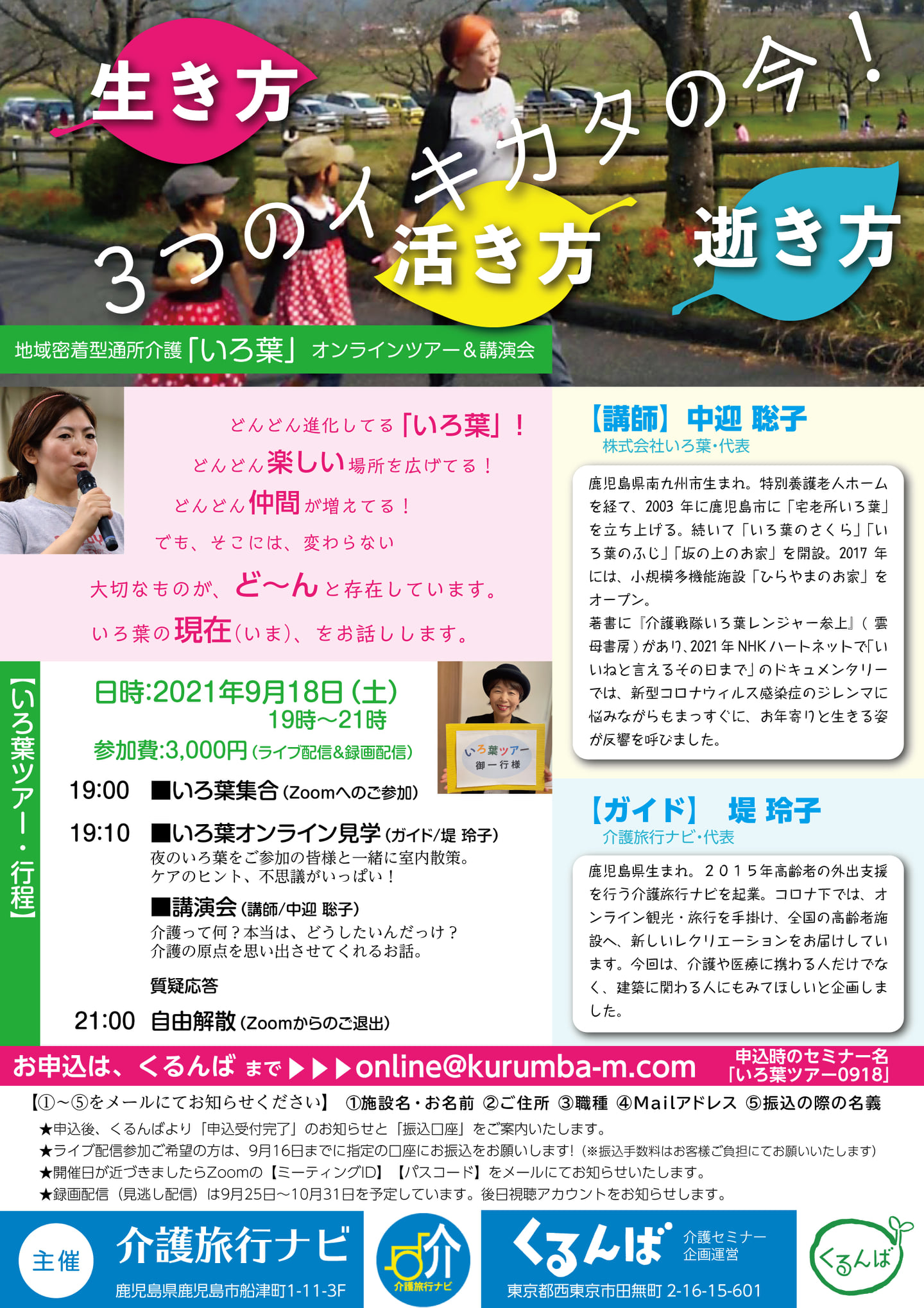 9月18日介護事業所「いろ葉」さん見学ツアー開催 2021年8月20日2021年8月20日 申込は「くるんば」さんまでonline@kurumba-m.com件名に「いろはツアー0918」と書いてください。①お名前(所属)②ご住所③職種④メールアドレス⑤振込の際の名義をメールに書いていただけると助かります。