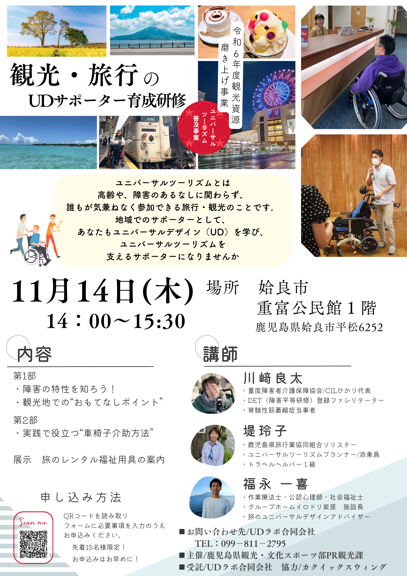 UDサポーター研修 鹿児島県4ケ所 2024年11月6日2024年11月6日 お申し込みはグーグルフォームからいただけますと助かります。https://docs.google.com/forms/d/1kB1VvTx_9c7dDX_5Gh169kZr7jPQ6S2tqyKMHGDpWxI/edit