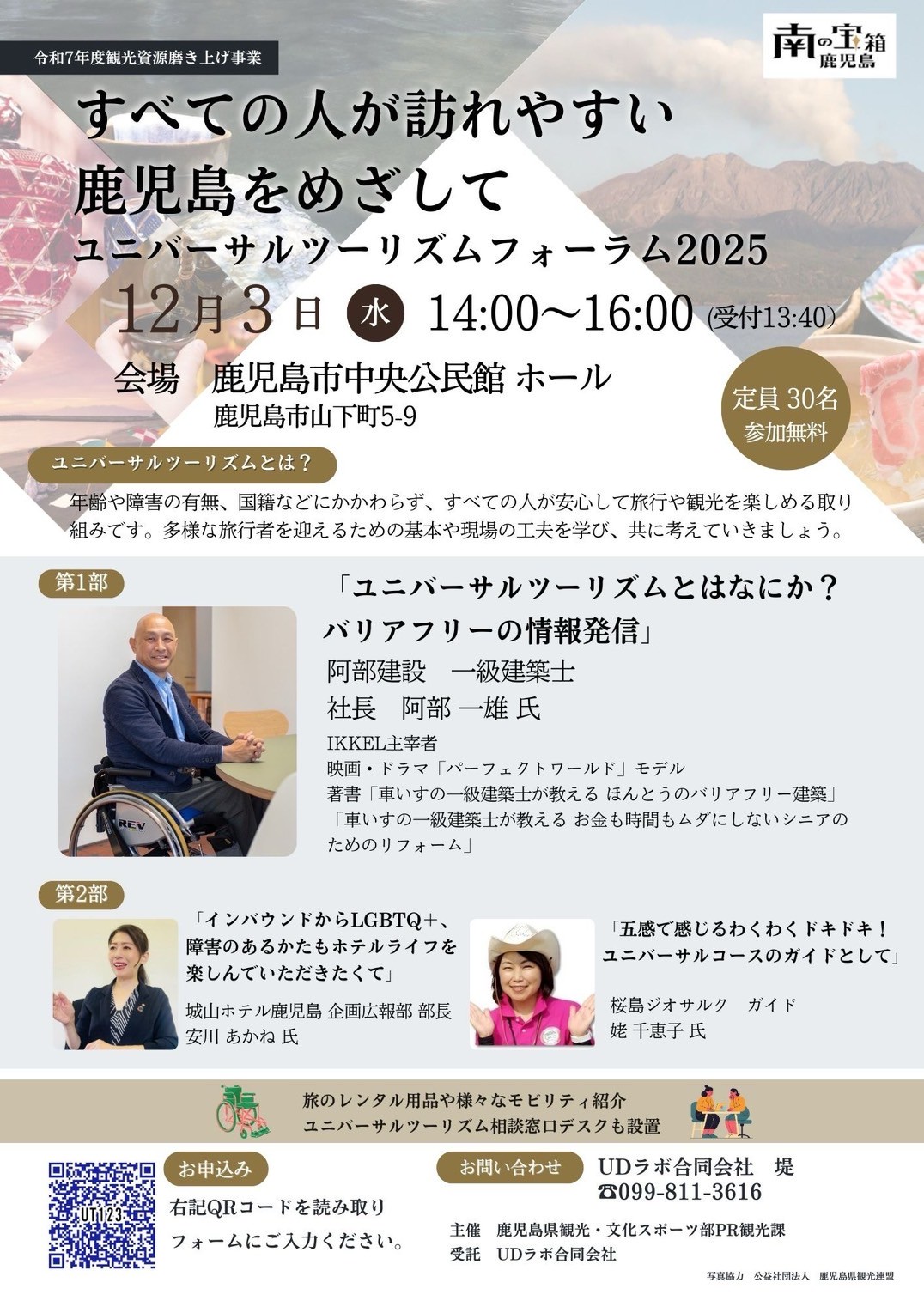 ユニバーサルツーリズムフォーラム 2025年11月19日 12月3日水曜日鹿児島中央公民館ホールお申し込みはこちらからどうぞ。2025ユニバーサルツーリズム普及・啓発セミナー – Google フォーム Facebook で共有するにはクリックしてください (新しいウィンドウで開きます) Facebook クリックして X で共有 (新しいウィンドウで開きます) X 関連